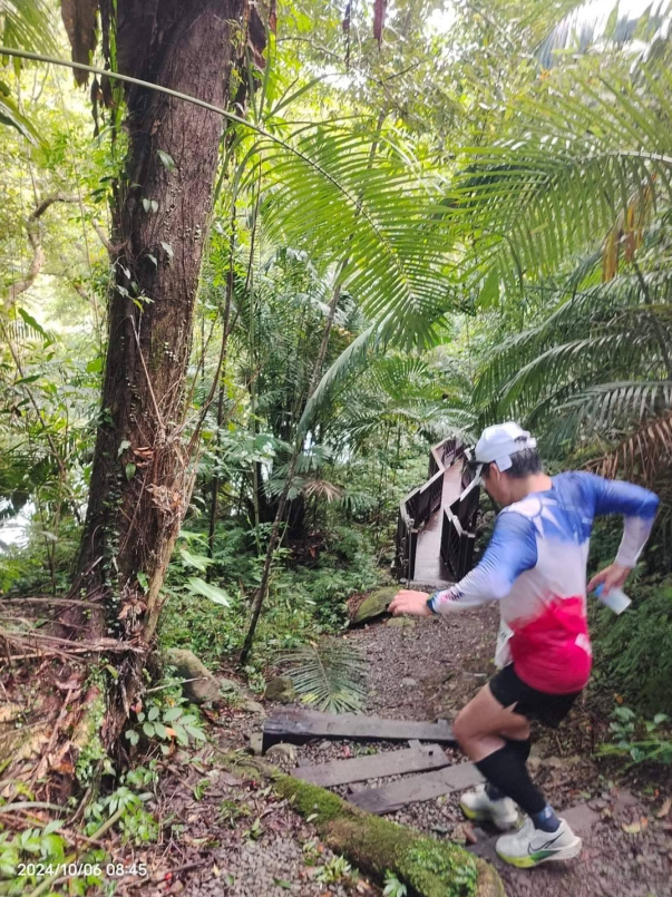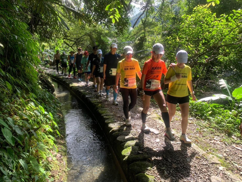 在吃完烤豬這補給站之後,接下來即將進入這場賽道的重頭戲~越野部分,包括圳溝碎石路、蝴蝶公園、福山觀景橋及溪瀧步道,不規則路面、石頭大小不一、有樹根的步道、有階梯、更有濕滑的水泥路面,對於一般跑者而言就要特別小心,而我們則一前一後慢慢一步步走著,非常感謝跟在我們後頭的跑者們耐心等候,幾次停下來請跑著先超車時大家不忘為我們加油,非常感謝台中松竹團陪跑員顯章自己報名賽事而幾乎陪跑全程並幫我們留下許多珍貴的照片。