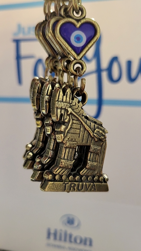 金屬材質的特洛伊木馬鑰匙圈,上端鑲嵌土耳其幸運物藍色眼睛,象徵趨吉避凶、馬到成功,跑馬、看馬、買馬,殺價5個100元(里拉),超值划算。馬拉松主題旅遊