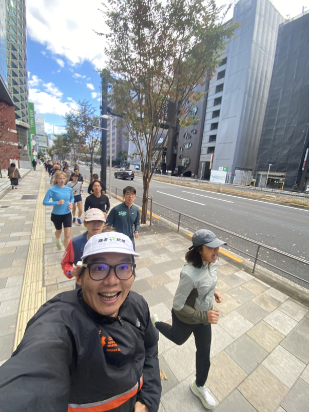 如果你本身就是個E人來參加這個活動應該會玩的很開心,但如果你跟我一樣是個I人跑者也不用太擔心,群體裡有幾位常常參加的跑友會主動跟你聊天,像下面照片中的藍色衣服的金髮妹妹Elisa她就很Nice跑到我旁邊用英文跟我聊天,她說她今年下半年要再次挑戰全馬(今年稍早跑了初馬),而她選擇的賽事是「台北馬拉松」,目標345內跑完(目前半馬成績1小時42分鐘),她非常認真的在吃課表,在跟我們週六跑完城市路跑後,隔天又去皇居完成了本次週期課表最後一個32公里長距離,大家如果有在台北馬遇到她記得幫她加油喔。