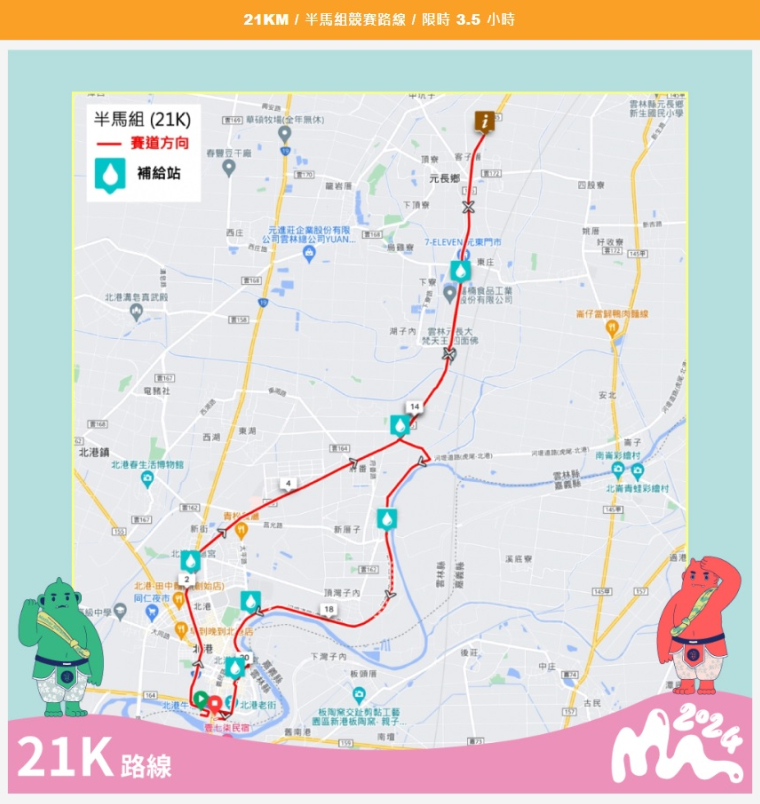 半馬組與全馬組-賽道部份,每距離 3公里左右就設置水站,跑者可以自己的體力狀態來適度補充水充與體力,讓自己在跑步活動中,可以充份補充水份與營養,可以順利回到終點;半馬組與全馬組的路線水站設置如下圖: