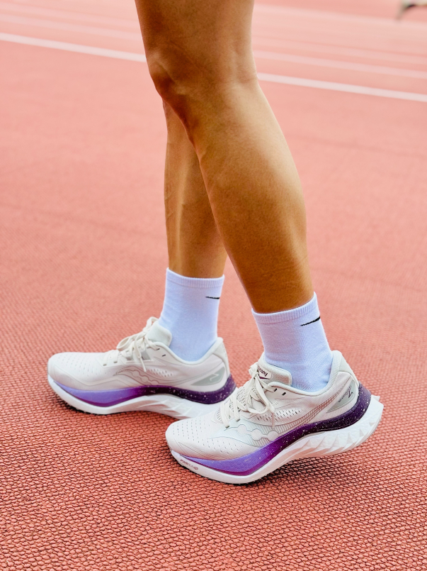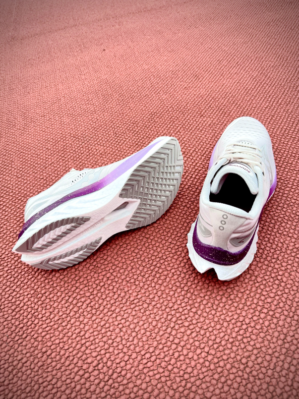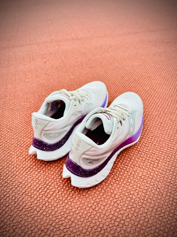 白色外觀搭配銀河紫的邊條,低調中帶有浪漫,在陽光下也顯得閃閃發亮。Saucony 是2025年高雄富邦馬拉松賽事的指定運動品牌,而其實Saucony有將自家鞋款分為1.輕量競速、2.緩衝避震、3.穩定支撐和4.越野系列,針對不同需求的跑者提供相應的鞋款。