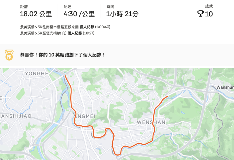 同樣是夜間跑步、同樣的寒風冷冽,身體對於鞋子逐漸適應的過程,更熟悉落腳點,讓整體更為順暢。在這18公里的慢跑中,不知不覺就創下了最佳成績,完成後還有些意猶未竟之感,畢竟一切都太順利了。