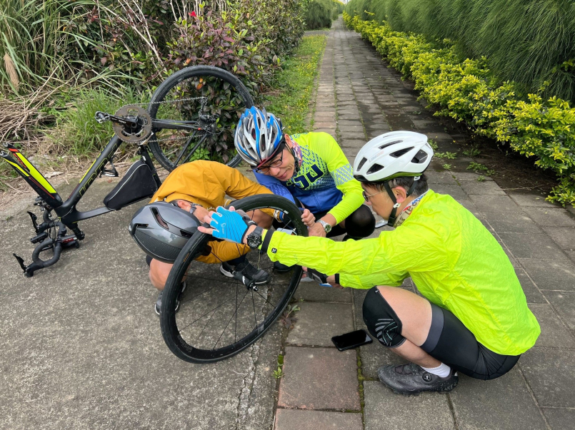 從 #復興空廚往 #林口竹林山觀音寺 的路上,前輪第二次破胎,同學協助換胎。