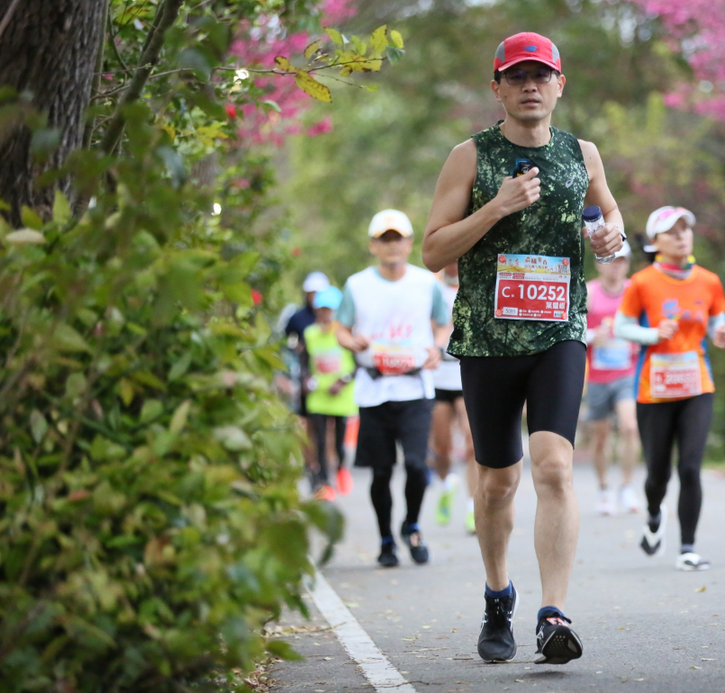 接著來到風光明媚的「潭雅神綠園道」,這是台中知名的腳踏車步道,風景宜人,沿途都有樹蔭環抱,路線平坦,可以加點速度進去,同時有段路線是與半馬、12公里組的選手共跑,人多熱鬧,氣氛歡樂。