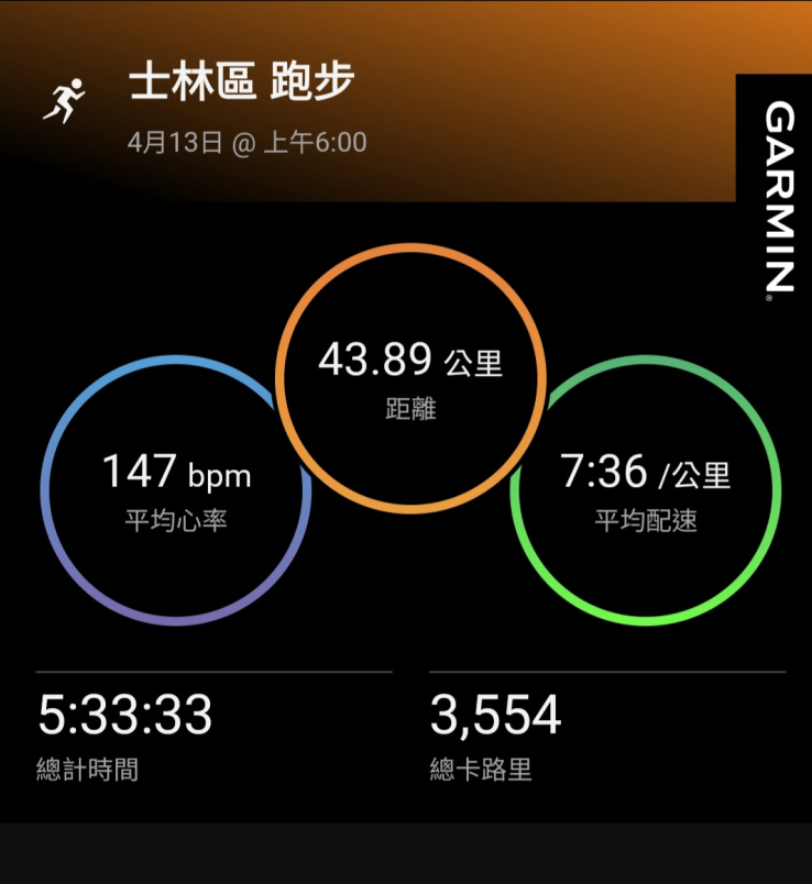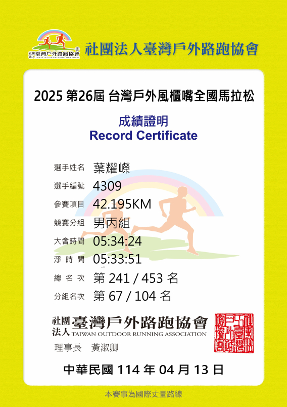 通過楓林橋、轉回至善路,身體似乎又找回活力,這段緩下坡竟然還能加速,還成功超車不少人。回到終點,個人晶片成績為 5:33:51,第14馬順利完成。雖然比預期的 5:30:00慢了3分鐘,但相較去年石碇馬,仍進步了14分鐘。只是如我賽前觀察,這場比賽高手如雲,所以相對排名,比石碇馬拉松退步不少。