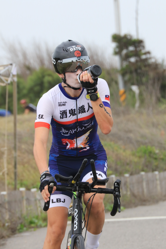 賽前聽大家說,澎湖的貪食蛇路線,是無比的曝曬、難跑,所以就買了一頂漁夫帽,看能不能跑得比較涼爽一點,結果!!比賽當天是陰天,風很大很涼爽,還有點冷,在此時我的裝扮,就顯得格外好笑,一點都不帥,不像帥氣的鐵人三項選手,帶著科技冰磚頭套般帥氣!!一跑出去,體感有點差,補給要帶的東西有點多,然後尿意又來了...再去上一次廁所!!(算了算,這場比賽共尿了7次之多...哀~都被尿尿耽誤了)