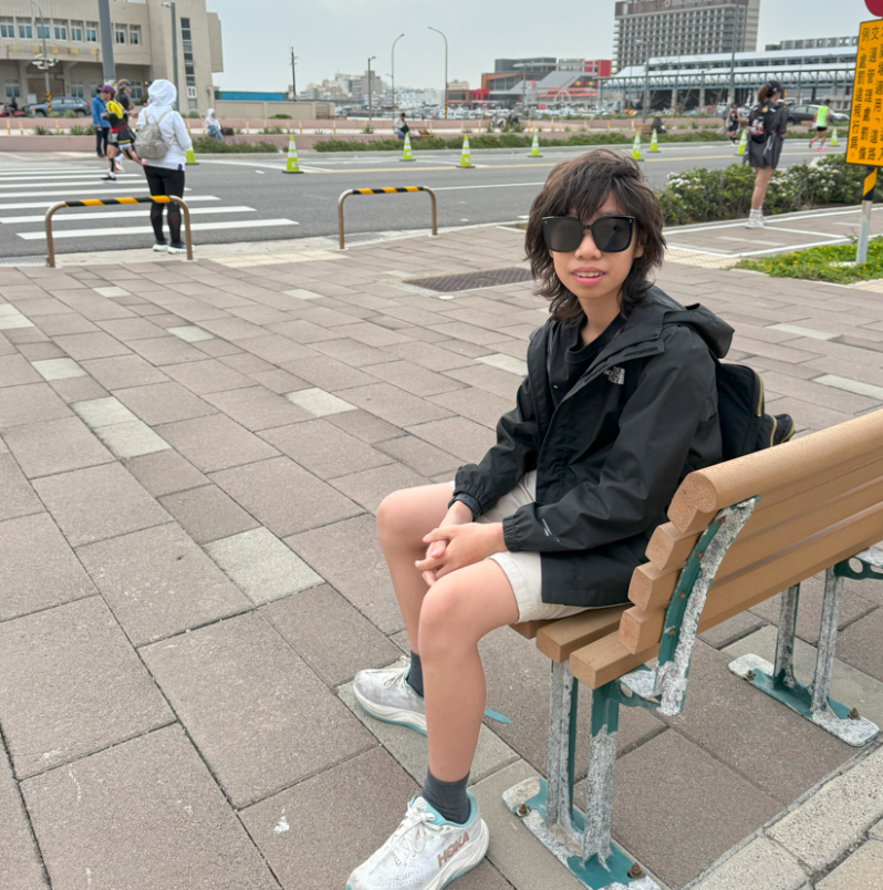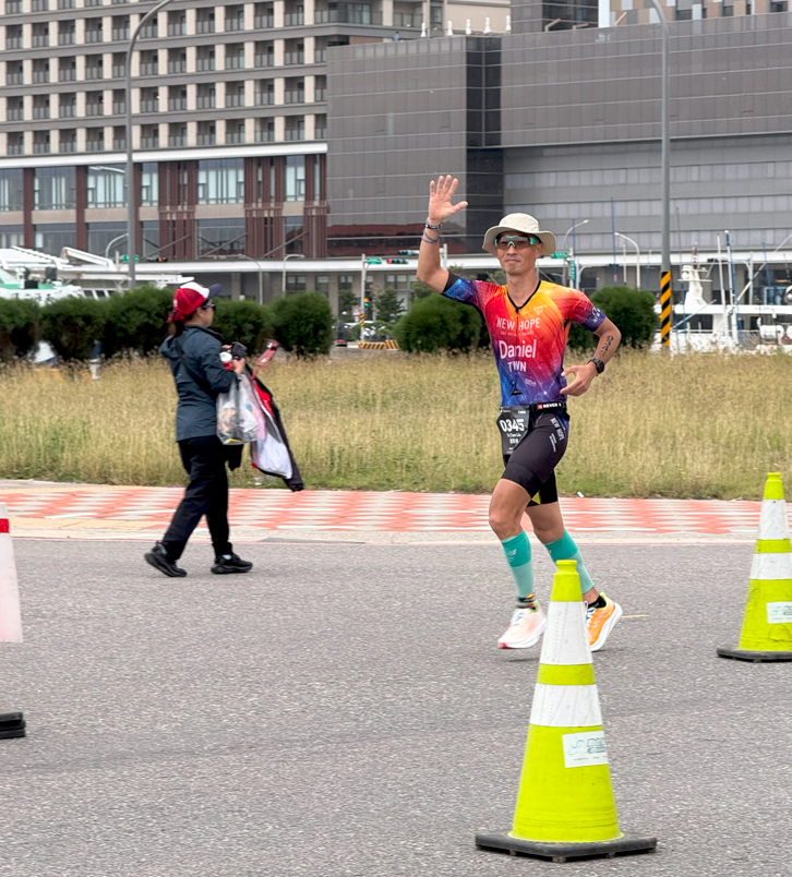 貪食蛇路線,一共要跑4圈,每圈10K,總距離42K。跑完第一圈,狀態總算有抓回來了,跑感還不錯、心情好,也就開始欣賞海港風景,在海港前繞來繞去,與認識的朋友相互加油打氣,看到前來幫學生加油的Sam教練,還能跟他開完笑地說~你在打電動嗎??看來我是真的跑得很愉快,但比賽就是要這樣享受賽道不是嗎??這次跑步段,全程沒有看錶,靠的是體感跑,能快則快,有點疲憊就主動降速恢復,看來策略實行的還不錯!!沒多久,又遇到牛哥(趴趴牛)在賽道上協助攝影,真的很感謝牛哥的拍攝,每次都讓我留下美美的比賽照片,超感謝的啦!!