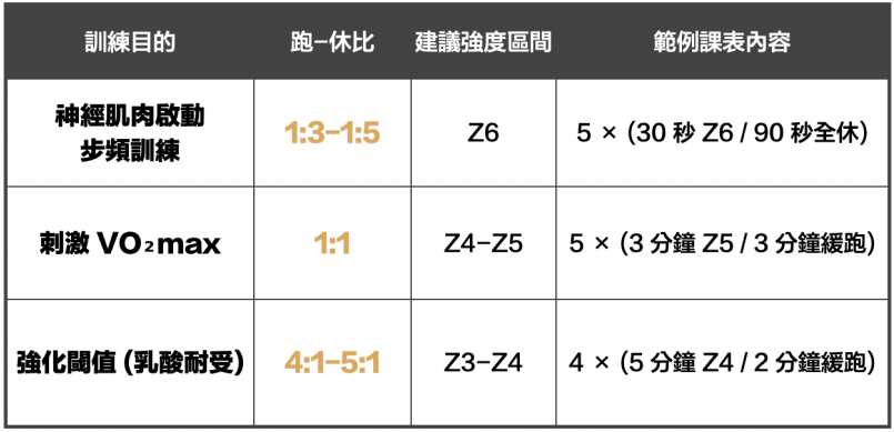 初學者建議從 Z3 開始進行節奏跑型間歇,讓身體熟悉高於日常配速的節奏與恢復模式。