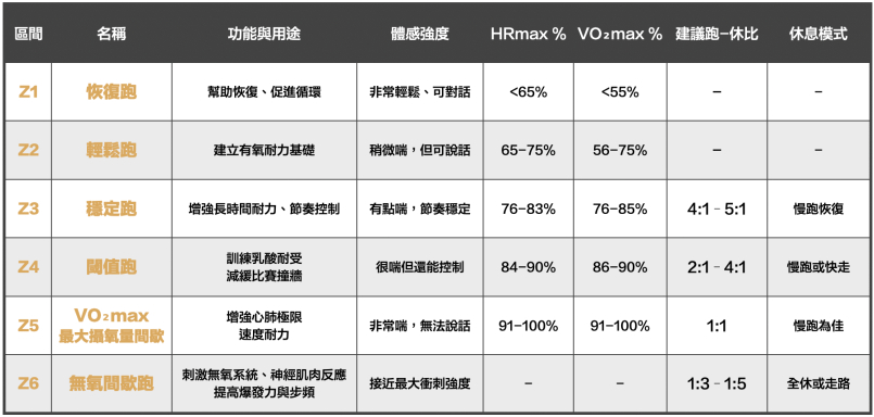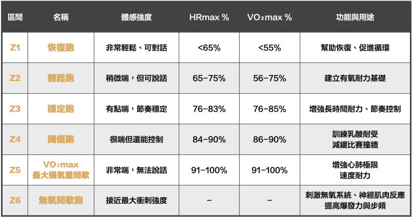 這些強度可以透過最大心率 (HRmax)、最大攝氧量百分比 (VO₂max%)、甚至體感來分級,幫助你精準鎖定當下該跑多快。