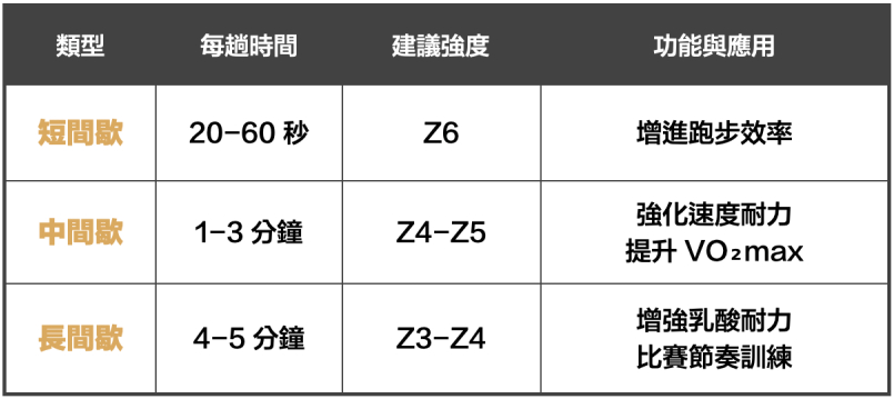 - 恢復方式: 400 公尺慢跑,不要完全走或停,保持節奏感