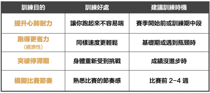 - 跑量建議: 至少週跑量穩定 30 公里以上再進入這種課表