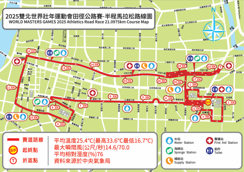 這次的 2025 雙北世界壯年運動會 公路賽(半馬)選擇在臺北市中心進行,整體來說是一條都市風格濃厚、路線變化豐富的賽道。路線雖沒有明顯高低起伏,但彎折多、節奏轉換頻繁,對於配速掌控提出更高要求。