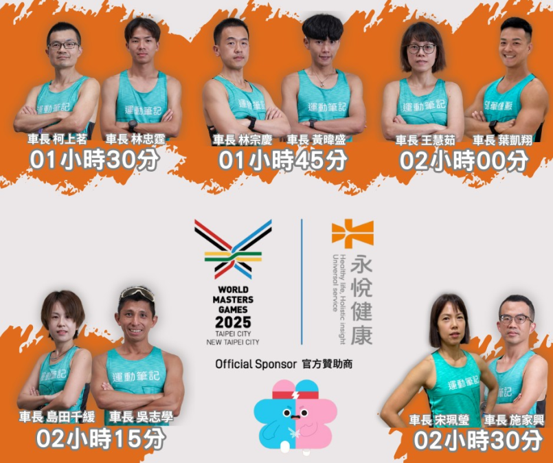這次2025雙北世界壯年運動會公路賽由運動筆記配速團隊擔任,共出動10位經驗豐富的配速員。