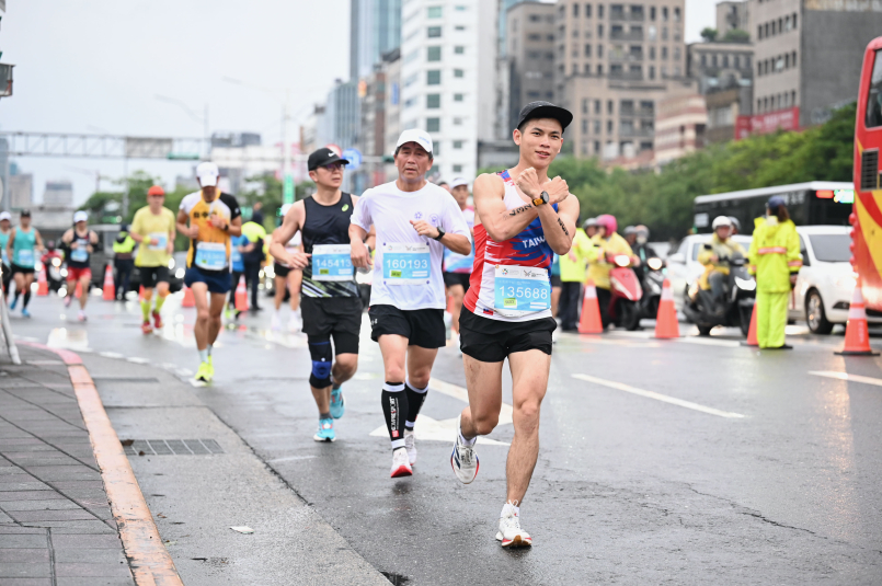 跟以往台北馬不同的是:限齡30+的跑者們,少了些擁擠,也少了些肅殺的氣氛;在涼爽的20°、外帶毛毛細雨中,充滿著怡然自得的祥和歡樂。