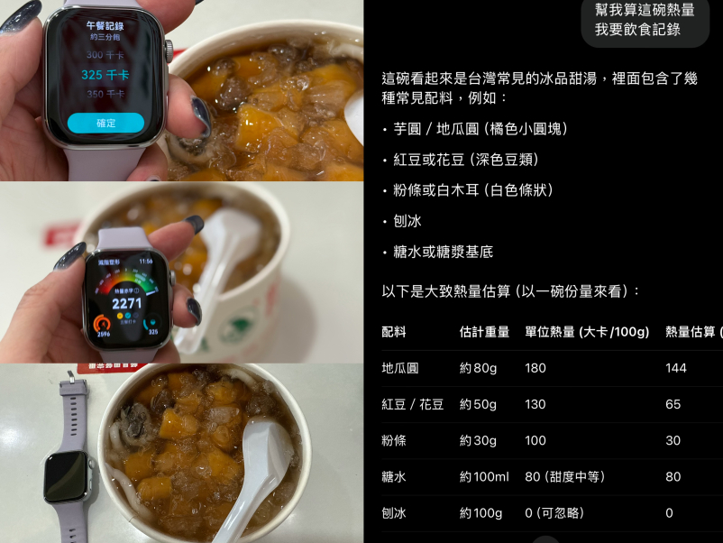 另外推一個熱量控制紀錄,每日三餐可以快速在手錶上記錄吃了什麼(還不需要移動到手機紀錄),然後跟到讓運動消耗做對比,簡單直接。我那天騎完車馬上試用這個功能,仗著騎了三個多小時,可以大補碳水,就跑去吃了東區粉圓,搭配 chatgpt 估計的熱量,三秒就完成飲食紀錄,有在減脂的朋友,這真是個非常方便的功能,不用再額外下載 MyFitnessPal 等等應用程式了。