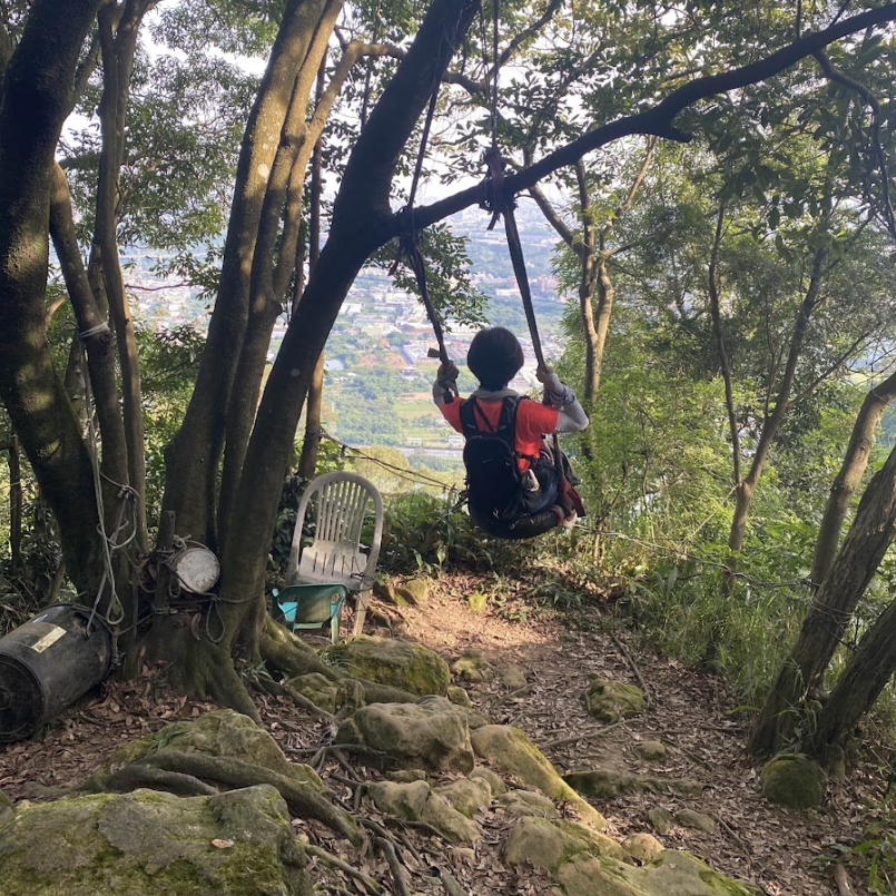 抵達鳶山彩壁之後,代表今天要走的路已過半程,往長春嶺的回程路段上,發現樹上綁了一個簡單的盪鞦韆,原先還有所懷疑的輕坐了一下,後來發現承重沒問題,甚至還可以輕鬆的盪起來,我與夫人兩人輪流坐在鞦韆上來回盪著,於此花了不少時間回味兒時的歡樂趣味