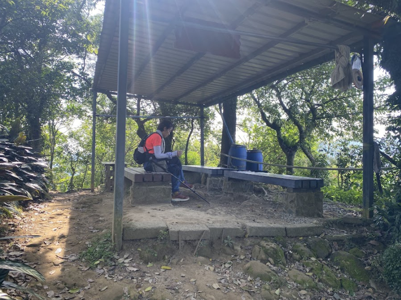 回到長春嶺小歇一會,此時 08:30 意即大概花了三小時一刻鐘的時間,走了約 3/4 的路程。接下來準備穿越這個涼亭,往後方的福德坑東峰方向前進