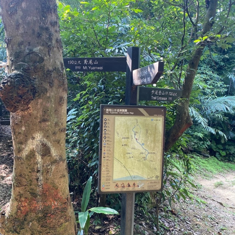 所有的幸福感在遇到這塊路標之後驟然消失。看著「鳶尾山步道導覽圖」再看看路標,朝右720公尺就可抵達步道登山口,但 APP 尋寶路線卻偏偏是往左邊的鳶尾山方向,心想不過190公尺而已,小事一樁,既來之則安之