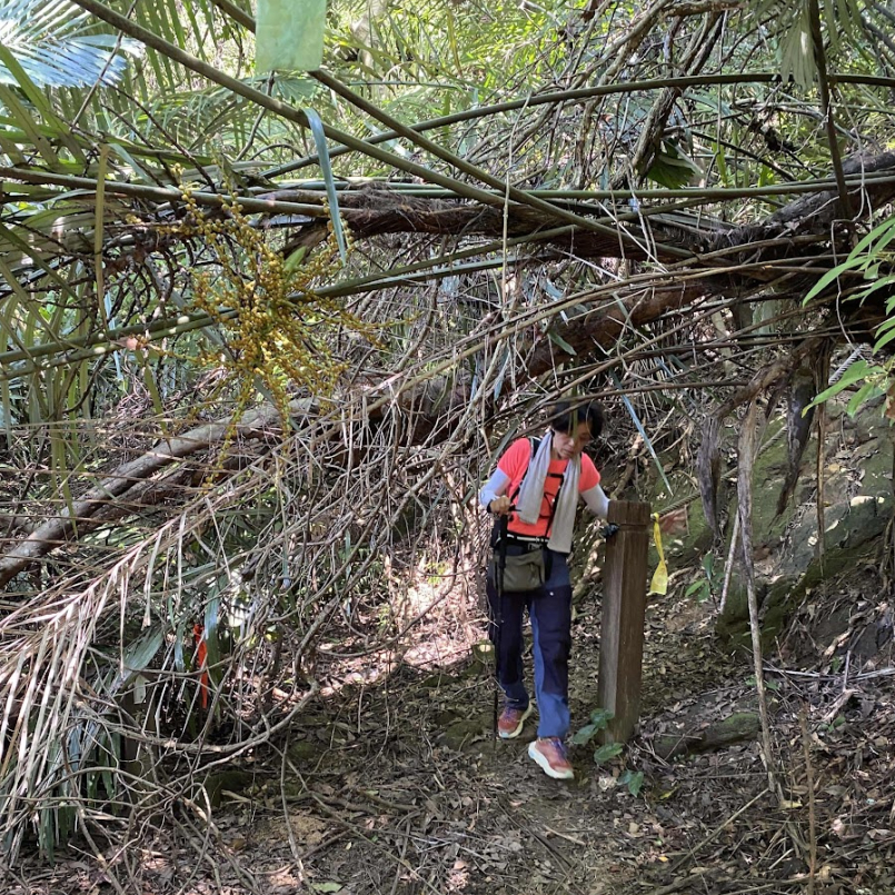 遇到這類倒木時,幾乎要彎腰蹲行慢步穿過,看著一旁的立柱路標,明明應該是一條完整規畫的健行步道,真不知何以成為如此狼狽的樣子