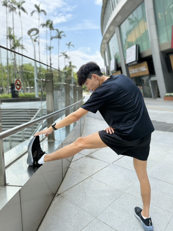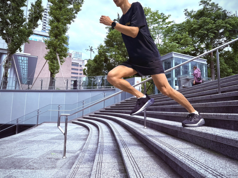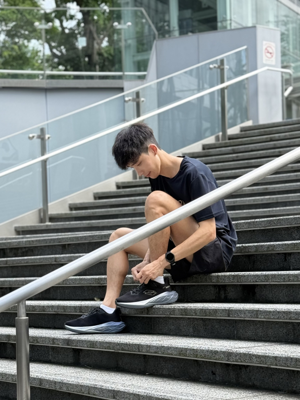 熱身階段,我選擇以階梯訓練的方式來感受鞋底的支撐性。上下階梯時,腳背位置的彈性與支撐恰到好處,既不緊繃也不鬆脫,在上樓梯時也能很好維持步伐,並能在下樓梯時感受到穩定性。由於我平常習慣穿寬楦鞋,這雙對我來說整體包覆感非常舒適,特別適合中等足型到偏寬楦的跑者。